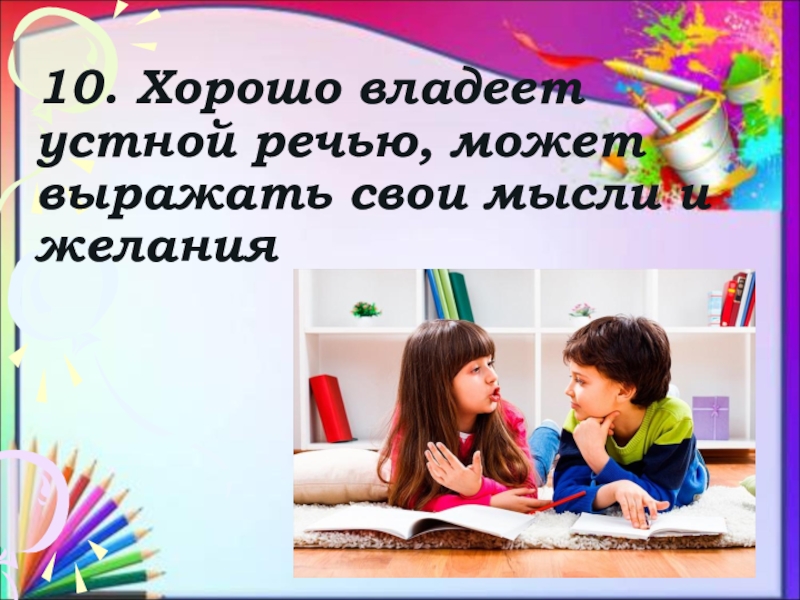 Слайд 2210. Хорошо владеет устной речью, может выражать свои мысли и желания