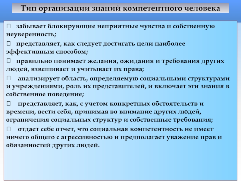 отдает себе отчет, что социальная компетентность не имеет ничего общего с агрессивностью и предполагает уважение прав и обязанностей других людей.