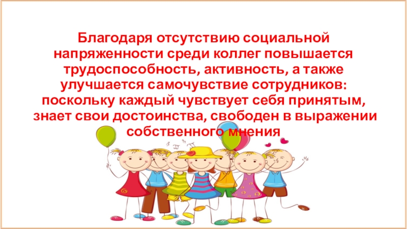 Слайд 8Благодаря отсутствию социальной напряженности среди коллег повышается трудоспособность, активность, а также