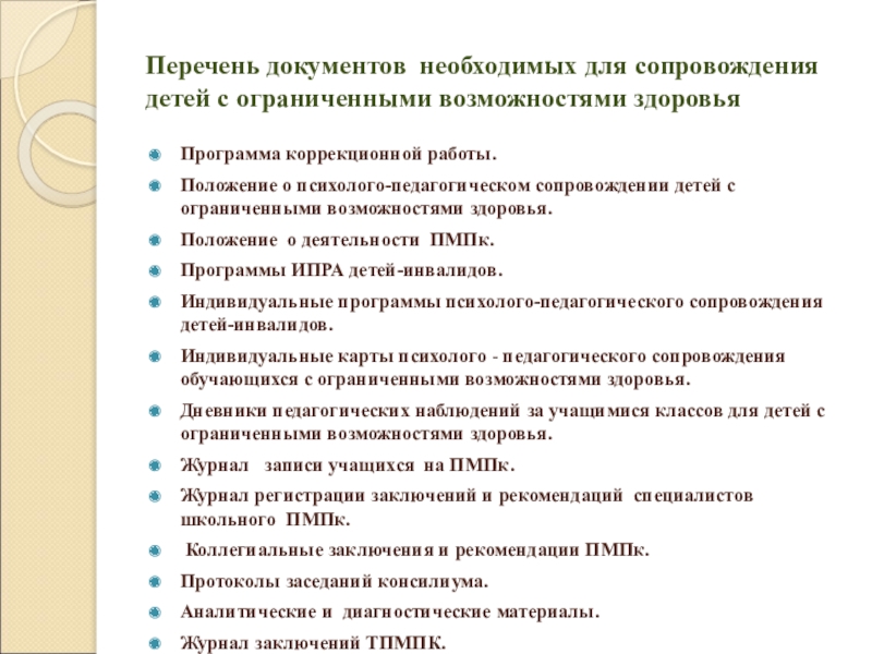 Слайд 20Перечень документов необходимых для сопровождения детей с ограниченными возможностями здоровья