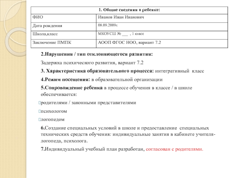 2.Нарушения / тип отклоняющегося развития: Задержка психического развития, вариант 7.23. Характеристика образовательного процесса: интегративный класс4.Режим посещения: в