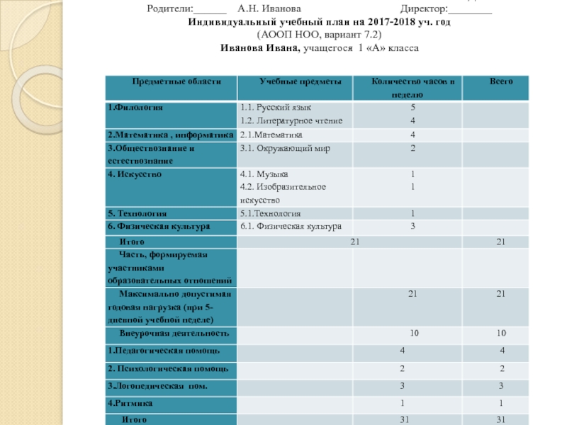 УТВЕРЖДАЮ Родители:______ А.Н. Иванова Директор:________ Индивидуальный учебный план на 2017-2018 уч. год (АООП НОО, вариант 7.2) Иванова Ивана, учащегося 1 «А» класса