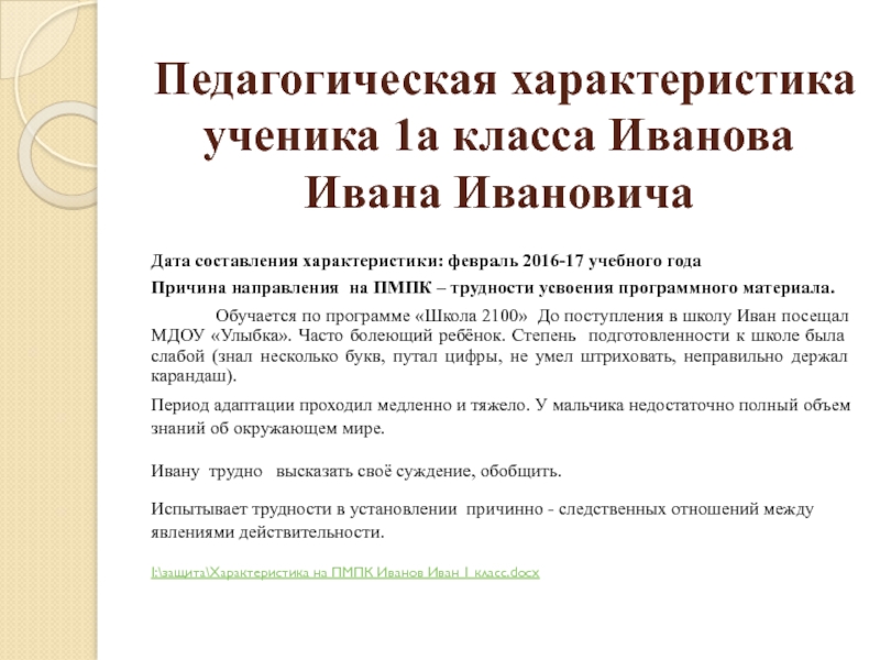 Педагогическая характеристика ученика 1а класса Иванова Ивана Ивановича Дата составления характеристики: февраль 2016-17 учебного года Причина направления на ПМПК – трудности усвоения программного материала. Обучается по программе «Школа 2100» До
