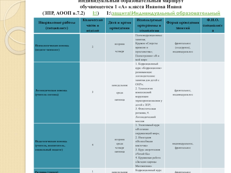 Слайд 6Индивидуальный образовательный маршрут обучающегося 1 «А» класса Иванова Ивана (ЗПР, АООП в.7.2)