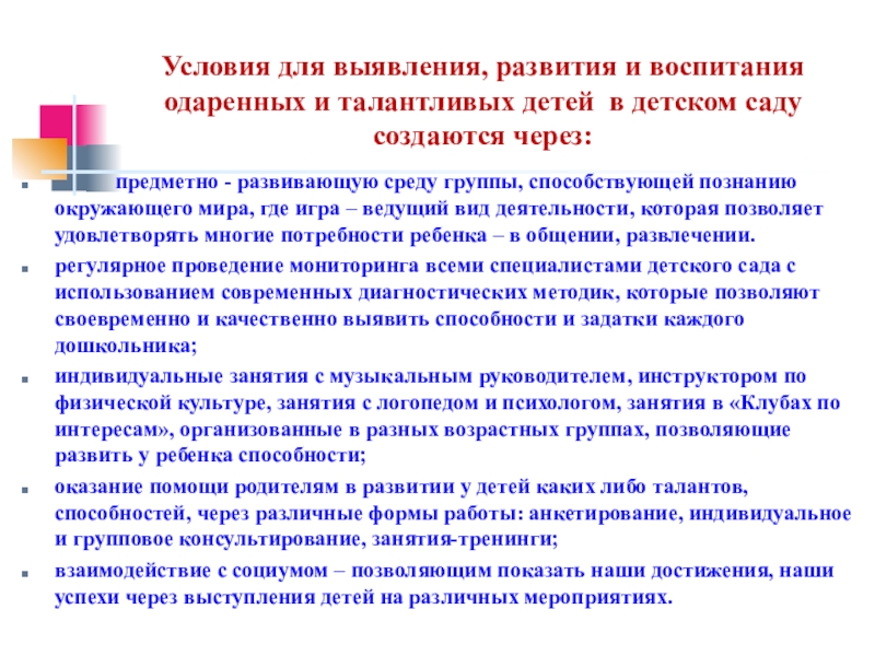 Условия для выявления, развития и воспитания одаренных и талантливых детей в детском саду создаются через: