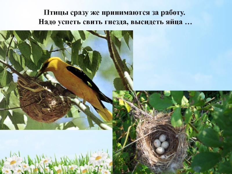 Слайд 5Птицы сразу же принимаются за работу. Надо успеть свить гнезда, высидеть