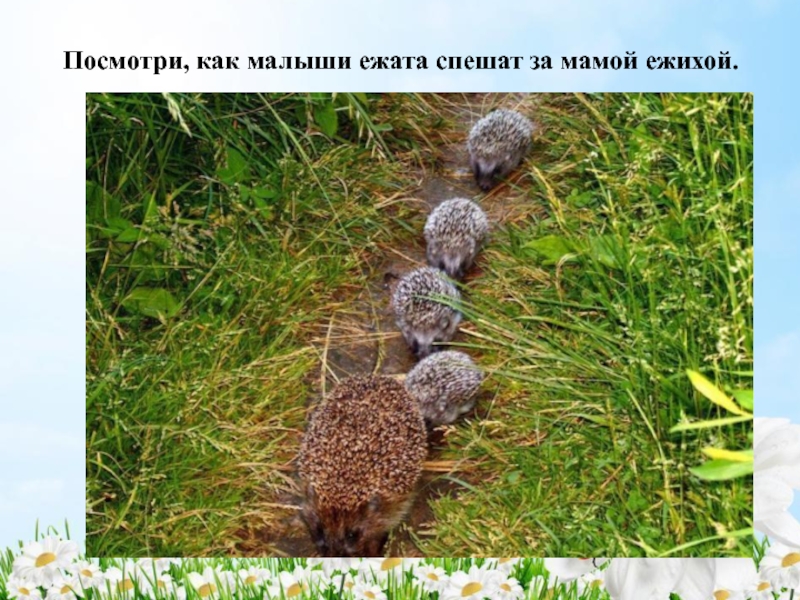 Слайд 11Посмотри, как малыши ежата спешат за мамой ежихой.