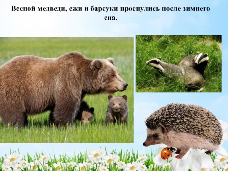 Слайд 8Весной медведи, ежи и барсуки проснулись после зимнего сна.