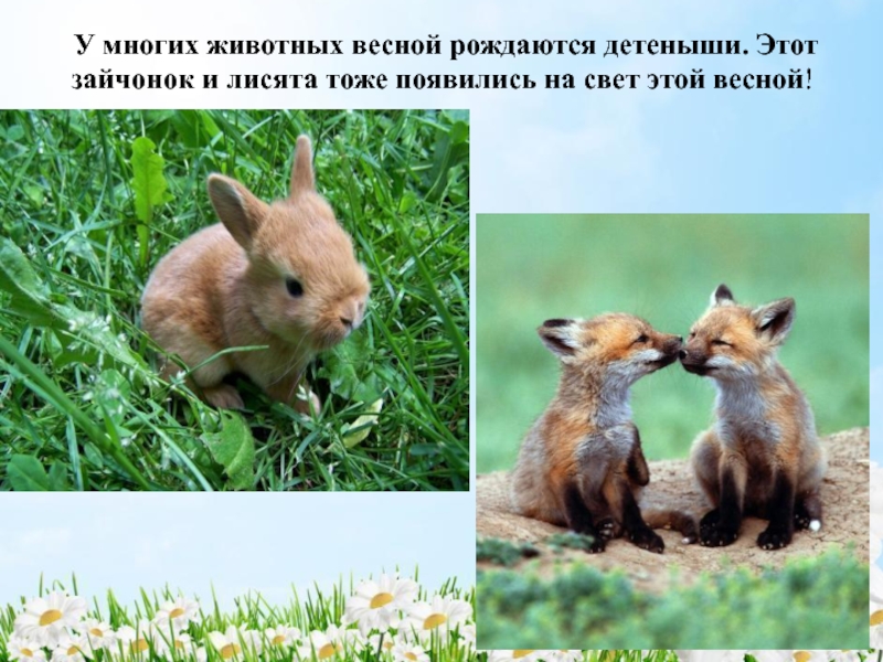 Слайд 9 У многих животных весной рождаются детеныши. Этот зайчонок и лисята