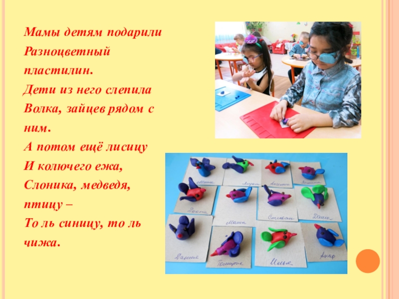 Мамы детям подарилиРазноцветныйпластилин.Дети из него слепилаВолка, зайцев рядом с ним. А потом ещё лисицуИ колючего ежа,Слоника, медведя,птицу