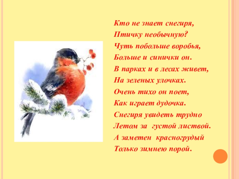 Кто не знает снегиря,Птичку необычную?Чуть побольше воробья,Больше и синички он.В парках и в лесах живет,На зеленых улочках.Очень