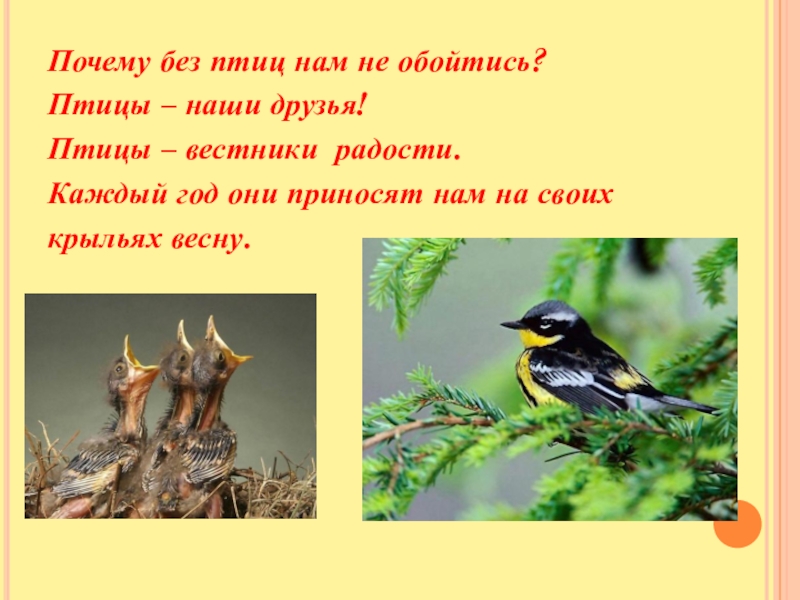 Почему без птиц нам не обойтись?Птицы – наши друзья! Птицы – вестники радости.Каждый год они приносят нам на своихкрыльях весну.