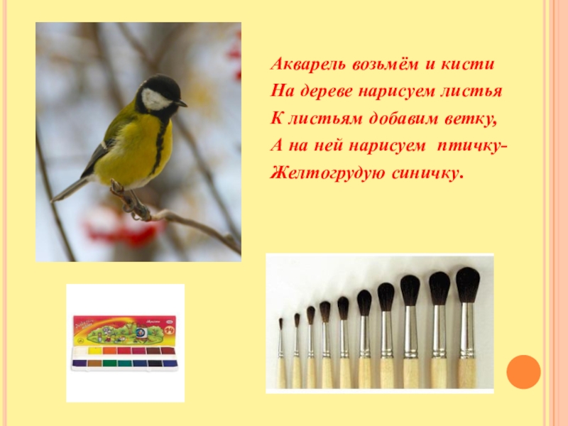 Акварель возьмём и кистиНа дереве нарисуем листьяК листьям добавим ветку,А на ней нарисуем птичку-Желтогрудую синичку.