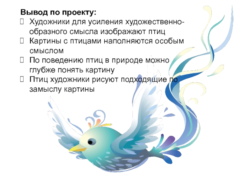Вывод по проекту: Художники для усиления художественно- образного смысла изображают птицКартины с птицами наполняются особым смысломПо поведению