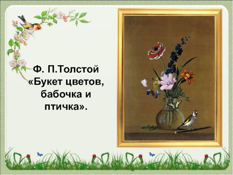 Слайд 5Ф. П.Толстой «Букет цветов, бабочка и птичка».