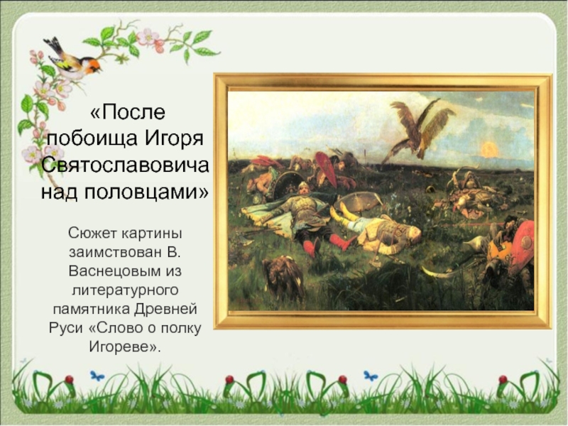 «После побоища Игоря Святославовича над половцами»  Сюжет картины заимствован В. Васнецовым из литературного памятника Древней