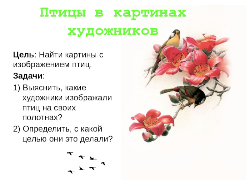 Птицы в картинах художниковЦель: Найти картины с изображением птиц.Задачи:1) Выяснить, какие художники изображали птиц на своих полотнах?2) Определить, с какой целью они это делали?