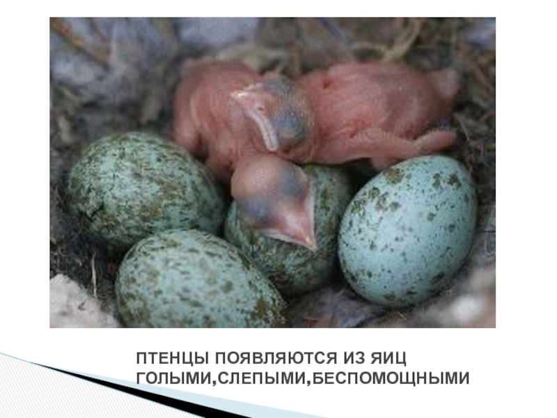 Слайд 22ПТЕНЦЫ ПОЯВЛЯЮТСЯ ИЗ ЯИЦ ГОЛЫМИ,СЛЕПЫМИ,БЕСПОМОЩНЫМИ
