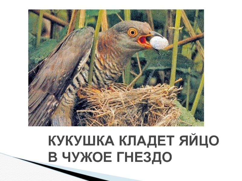 Слайд 20КУКУШКА КЛАДЕТ ЯЙЦО В ЧУЖОЕ ГНЕЗДО