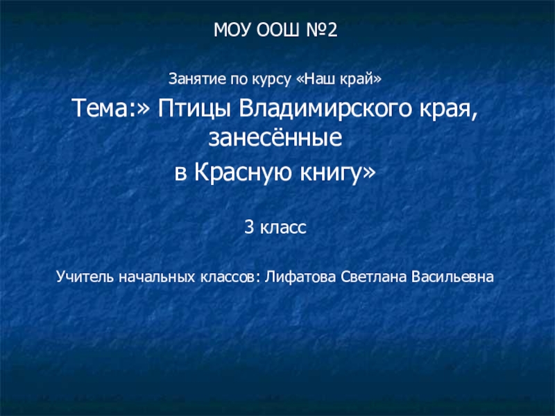 МОУ ООШ №2Занятие по курсу «Наш край»Тема:» Птицы Владимирского края, занесённые в Красную книгу»3 классУчитель начальных классов: