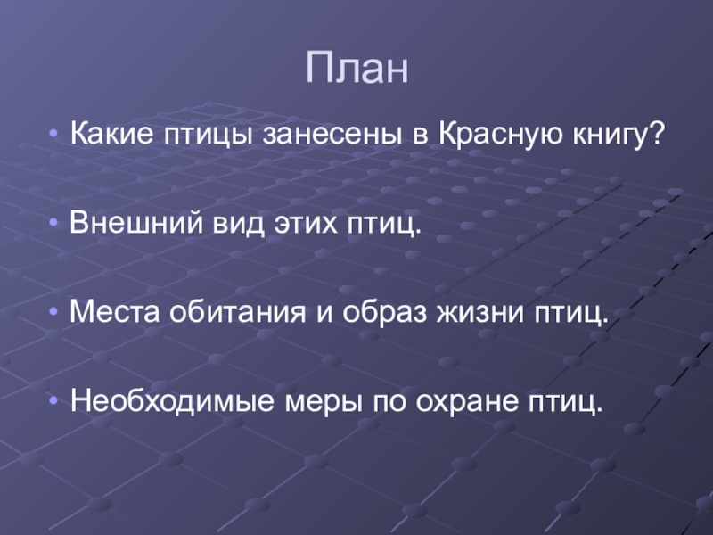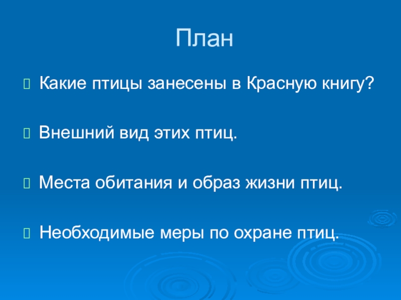 ПланКакие птицы занесены в Красную книгу?Внешний вид этих птиц.	Места обитания и образ жизни птиц.Необходимые меры по охране