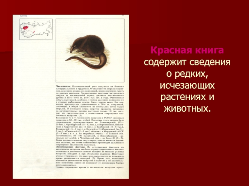 Слайд 4Красная книга содержит сведения о редких, исчезающих растениях и животных.