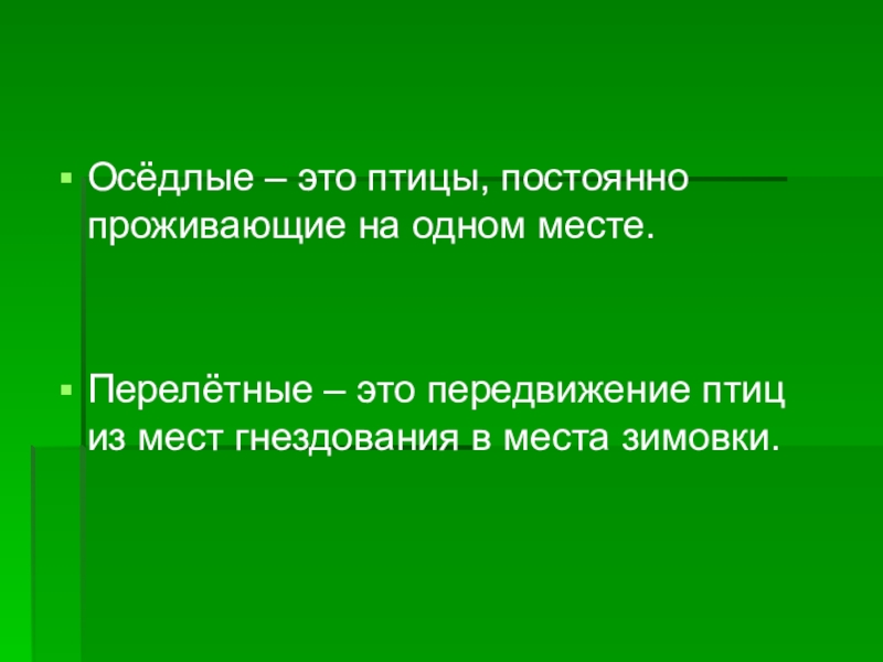 Осёдлые – это птицы, постоянно проживающие на одном месте.Перелётные – это передвижение птиц из мест гнездования в