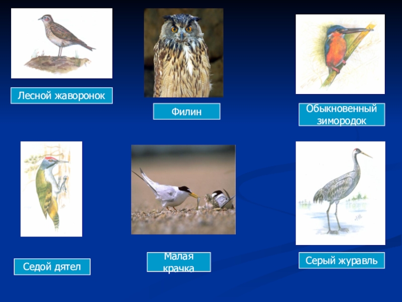 Лесной жаворонокСедой дятелОбыкновенный зимородокСерый журавльФилинМалая крачка