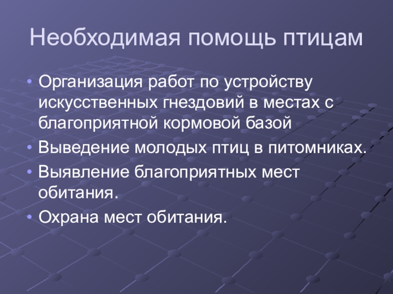 Необходимая помощь птицам Организация работ по устройству искусственных гнездовий в местах с благоприятной кормовой базойВыведение молодых птиц