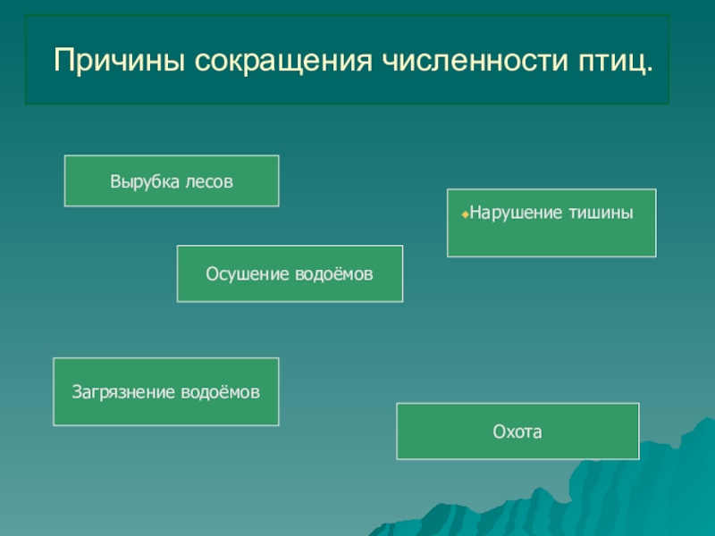 Причины сокращения численности птиц.Вырубка лесовОсушение водоёмовНарушение тишиныЗагрязнение водоёмовОхота