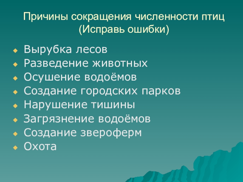 Слайд 24Причины сокращения численности птиц (Исправь ошибки)