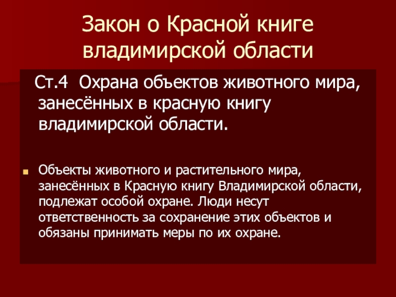Закон о Красной книге владимирской области Ст.4 Охрана объектов животного мира, занесённых в красную книгу владимирской области.Объекты