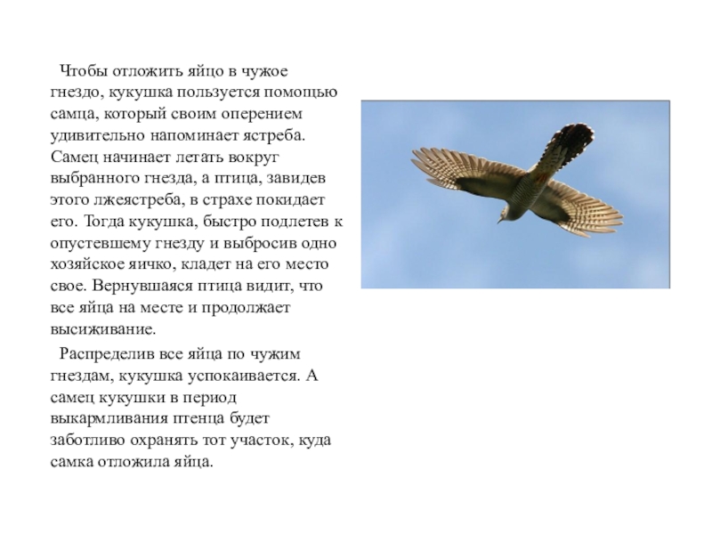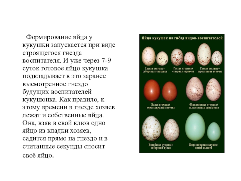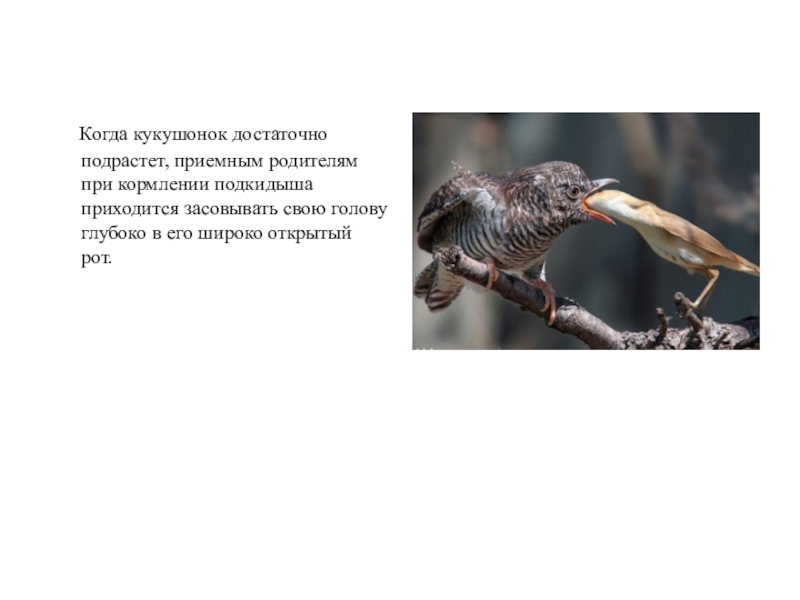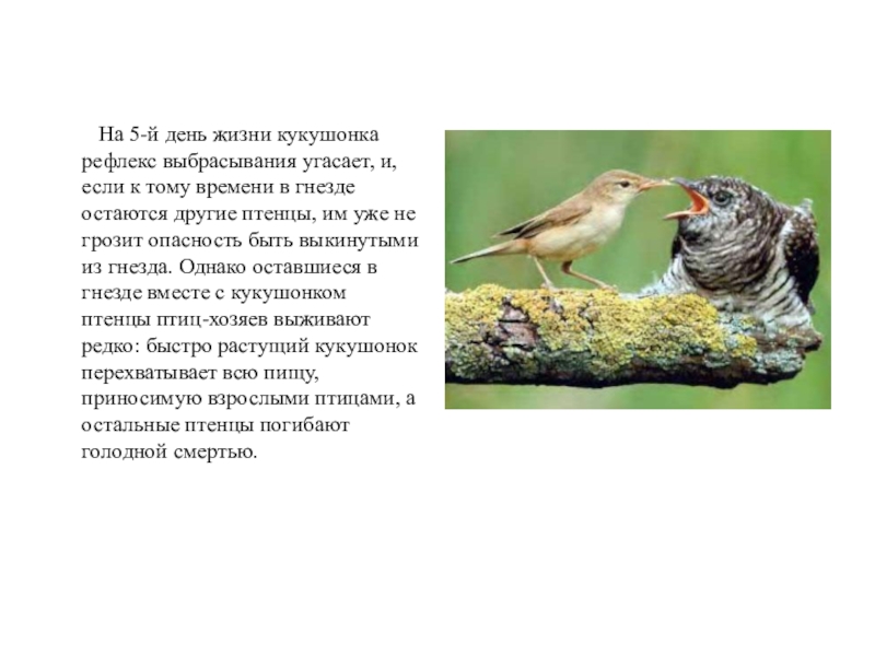 Когда это ему удается, кукушонок несколькими толчками тела продвигает жертву на спину. Придерживая на своей широкой, несколько вогнутой спине яйцо или птенца вскинутыми далеко вверх крылышками, кукушонок пятится к борту гнезда. Добравшись до внутренней стенки гнезда, он поднимается на вытянутых ногах и резким толчком тела выбрасывает находящийся на его спине предмет через край гнезда. Таким образом, в течение 3—4 дней кукушонок обычно избавляется от «сводных» братьев и сестер.