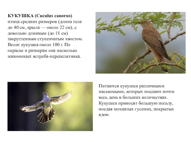 Питаются кукушки различными насекомыми, которых поедают почти весь день в больших количествах. Кукушки приносят большую пользу, поедая мохнатых гусениц, покрытых ядом.