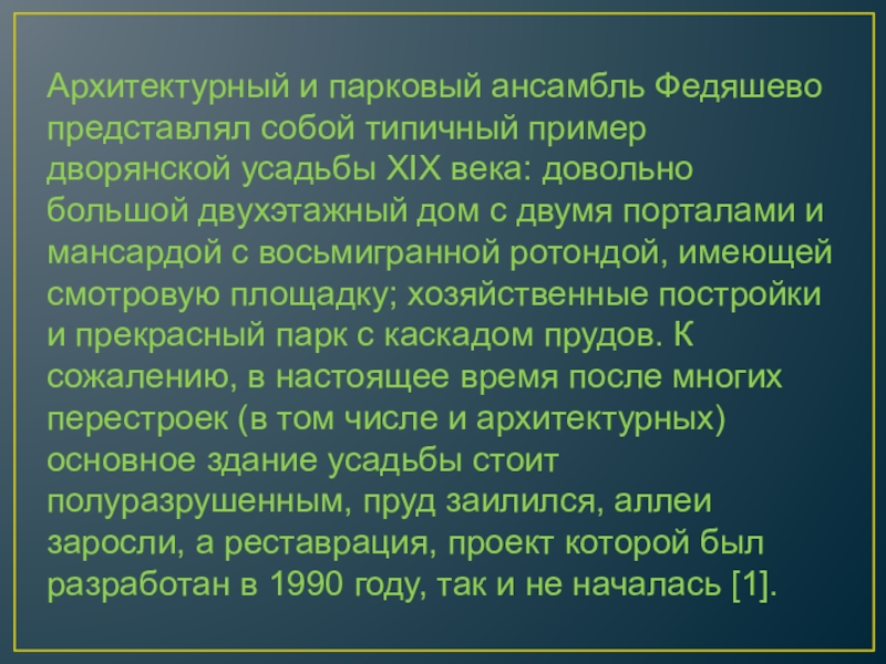 Слайд 8Архитектурный и парковый ансамбль Федяшево представлял собой типичный пример дворянской усадьбы