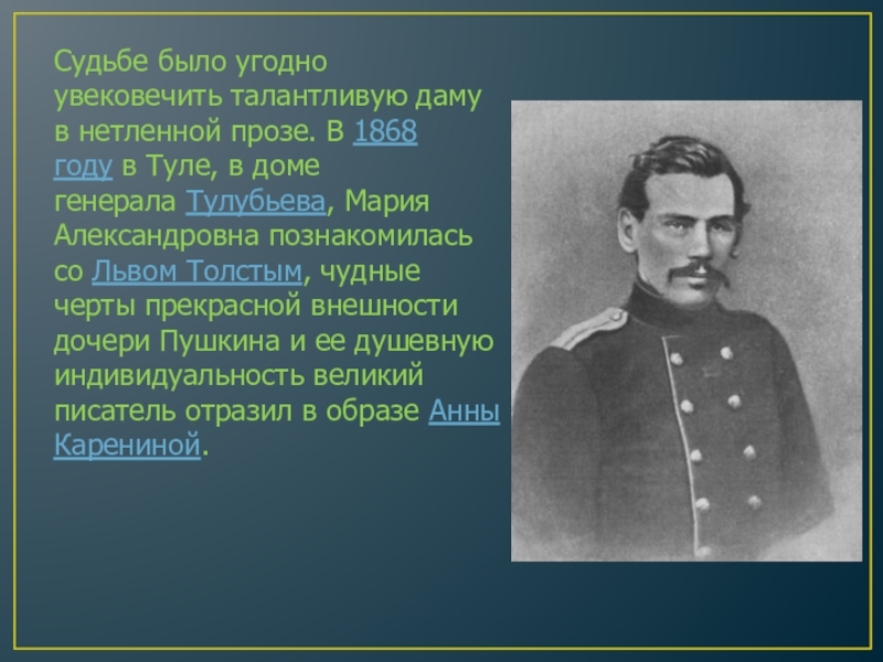 Туле, в доме генерала Тулубьева, Мария Александровна познакомилась со Львом Толстым, чудные черты прекрасной внешности дочери Пушкина и ее душевную индивидуальность великий писатель отразил в образе Анны Карениной.