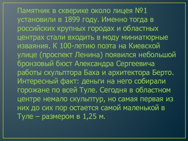 тогда в российских крупных городах и областных центрах стали входить в моду миниатюрные изваяния. К 100-летию поэта на Киевской улице (проспект Ленина) появился небольшой бронзовый бюст Александра Сергеевича работы скульптора Баха и архитектора Берто. Интересный факт: деньги на него собирали горожане по всей Туле. Сегодня в областном центре немало скульптур, но самая первая из них до сих пор остается самой маленькой в Туле – размером в 1,25 м.