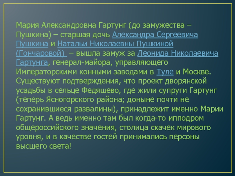 Пушкина и Натальи Николаевны Пушкиной (Гончаровой) – вышла замуж за Леонида Николаевича Гартунга, генерал-майора, управляющего Императорскими конными заводами в Туле и Москве. Существуют подтверждения, что проект дворянской усадьбы в сельце Федяшево, где жили супруги Гартунг (теперь Ясногорского района; доныне почти не сохранившиеся развалины), принадлежит именно Марии Гартунг. А ведь именно там был когда-то ипподром общероссийского значения, столица скачек мирового уровня, и в качестве гостей принимались персоны высшего света!