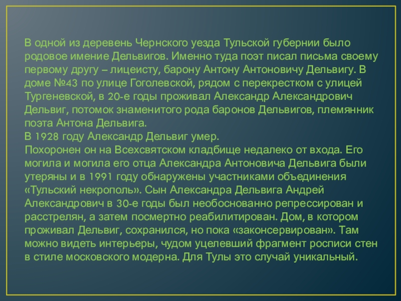 Дельвигов. Именно туда поэт писал письма своему первому другу – лицеисту, барону Антону Антоновичу Дельвигу. В доме №43 по улице Гоголевской, рядом с перекрестком с улицей Тургеневской, в 20-е годы проживал Александр Александрович Дельвиг, потомок знаменитого рода баронов Дельвигов, племянник поэта Антона Дельвига.