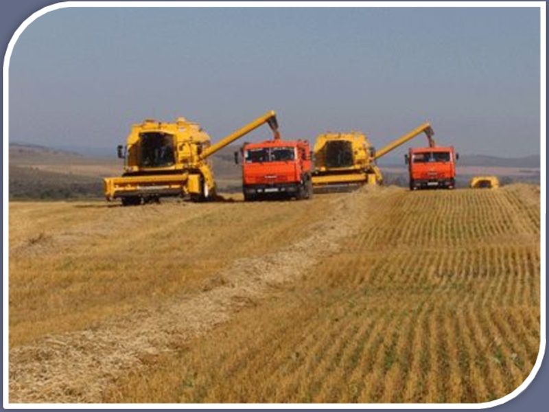 Слайд 5Пришла пора убирать урожай. На поле выходят комбайны.