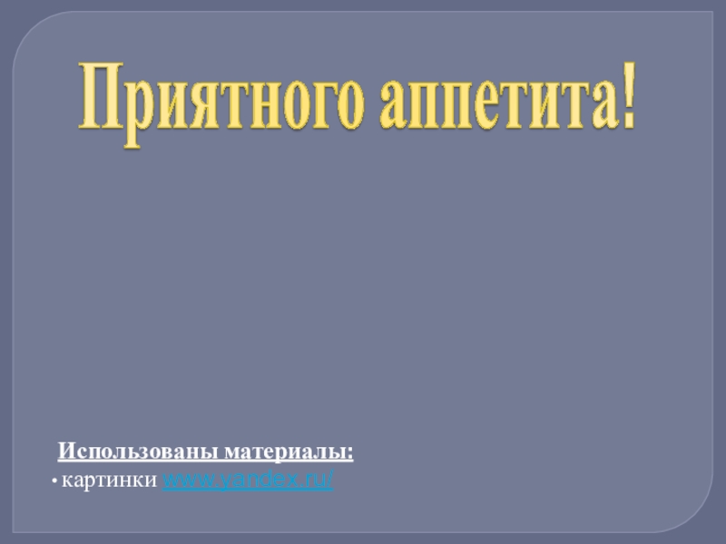Приятного аппетита!Использованы материалы: картинки www.yandex.ru/