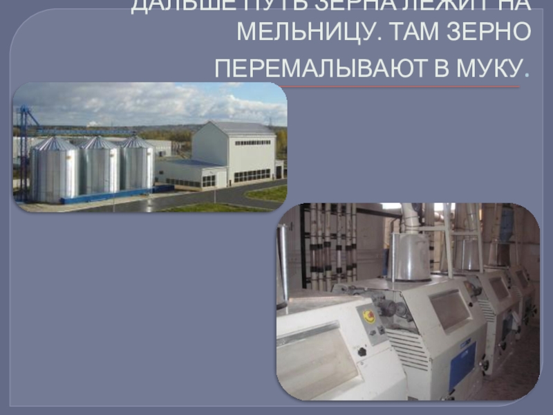 Слайд 9ДАЛЬШЕ ПУТЬ ЗЕРНА ЛЕЖИТ НА МЕЛЬНИЦУ. ТАМ ЗЕРНО ПЕРЕМАЛЫВАЮТ В МУКУ.