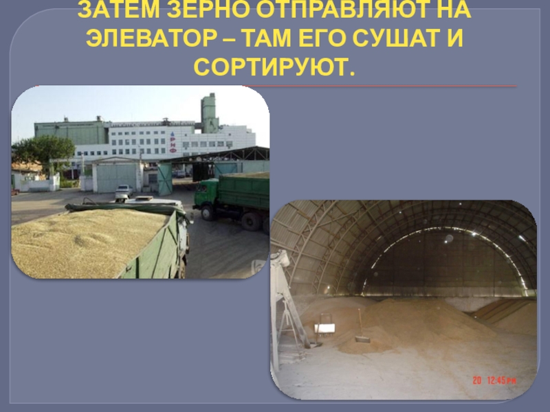 Слайд 7ЗАТЕМ ЗЕРНО ОТПРАВЛЯЮТ НА ЭЛЕВАТОР – ТАМ ЕГО СУШАТ И СОРТИРУЮТ.