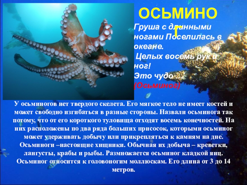 У осьминогов нет твердого скелета. Его мягкое тело не имеет костей и может свободно изгибаться в разные стороны. Назвали осьминога так потому, что от его короткого туловища отходят восемь конечностей. На них расположены по два ряда больших присосок, которыми осьминог может удерживать добычу или прикрепляться к камням на дне. Осьминоги –настоящие хищники. Обычная их добыча – креветки, лангусты, крабы и рыбы. Размножается осьминог кладкой яиц. Осьминог относится к головоногим моллюскам. Его длина от 3 до 14 метров.