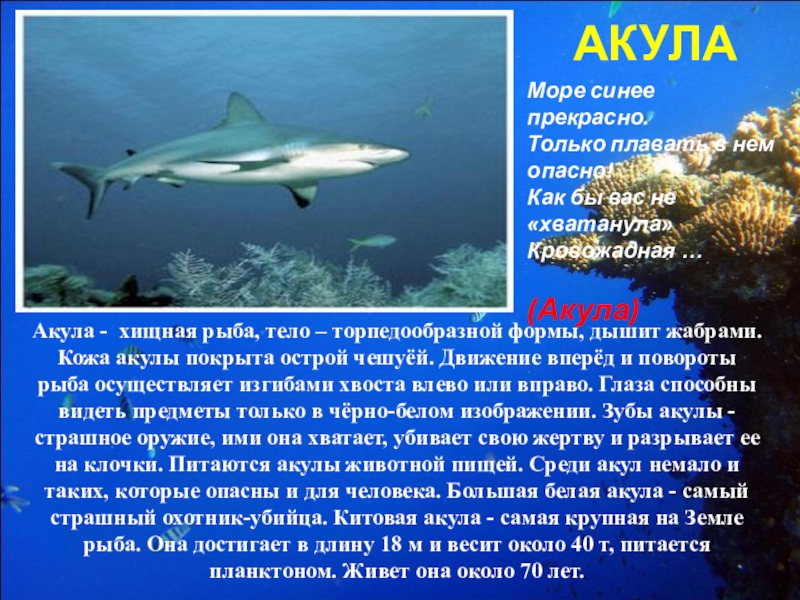 Акула - хищная рыба, тело – торпедообразной формы, дышит жабрами. Кожа акулы покрыта острой чешуёй. Движение вперёд и повороты рыба осуществляет изгибами хвоста влево или вправо. Глаза способны видеть предметы только в чёрно-белом изображении. Зубы акулы - страшное оружие, ими она хватает, убивает свою жертву и разрывает ее на клочки. Питаются акулы животной пищей. Среди акул немало и таких, которые опасны и для человека. Большая белая акула - самый страшный охотник-убийца. Китовая акула - самая крупная на Земле рыба. Она достигает в длину 18 м и весит около 40 т, питается планктоном. Живет она около 70 лет.