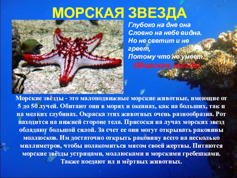 Морские звёзды - это малоподвижные морские животные, имеющие от 5 до 50 лучей. Обитают они в морях и океанах, как на больших, так и на мелких глубинах. Окраска этих животных очень разнообразна. Рот находится на нижней стороне тела. Присоски на лучах морских звезд обладают большой силой. За счет ее они могут открывать раковины моллюсков. Им достаточно открыть раковину всего на несколько миллиметров, чтобы полакомиться мясом своей жертвы. Питаются морские звёзды устрицами, моллюсками и морскими гребешками. Также поедают ил и мёртвых животных.