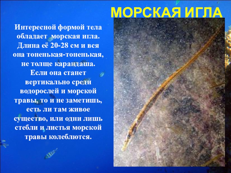 В море встречаются рыбы, на рыб вовсе не похожие, например, морской конёк. Изгиб его шеи напоминает изгиб шеи у лошади, поэтому его так и назвали. Но когда он плывёт, он вытягивается и становится больше похожим на иголку, чем на коня. Тело покрыто щитками с длинными выростами – ниточками и заканчивается закручивающимся хвостом. Он вовсе не похож на хвост рыбы, но это интересное животное – настоящая рыба. Ухватится морской конёк своим хвостом за какое-нибудь подводное растение и сидит неподвижно, добычу подкарауливает. Вдвойне хорошо ему от такой формы тела: и добыча не сразу заметит его и враги проплывут мимо. Вот он и сыт и цел.