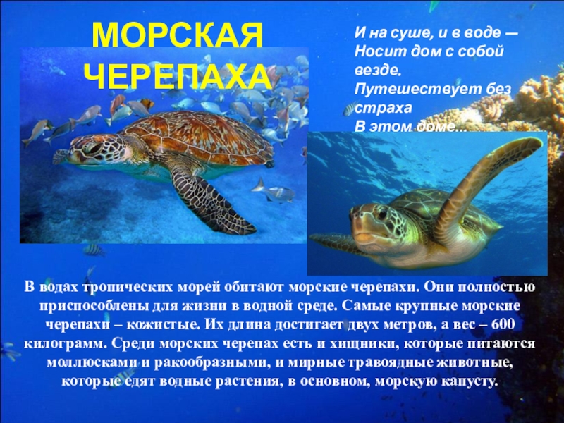 В водах тропических морей обитают морские черепахи. Они полностью приспособлены для жизни в водной среде. Самые крупные морские черепахи – кожистые. Их длина достигает двух метров, а вес – 600 килограмм. Среди морских черепах есть и хищники, которые питаются моллюсками и ракообразными, и мирные травоядные животные, которые едят водные растения, в основном, морскую капусту.