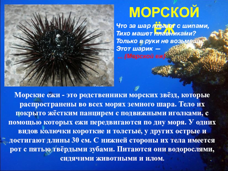 Морские ежи - это родственники морских звёзд, которые распространены во всех морях земного шара. Тело их покрыто жёстким панцирем с подвижными иголками, с помощью которых ежи передвигаются по дну моря. У одних видов колючки короткие и толстые, у других острые и достигают длины 30 см. С нижней стороны их тела имеется рот с пятью твёрдыми зубами. Питаются они водорослями, сидячими животными и илом.