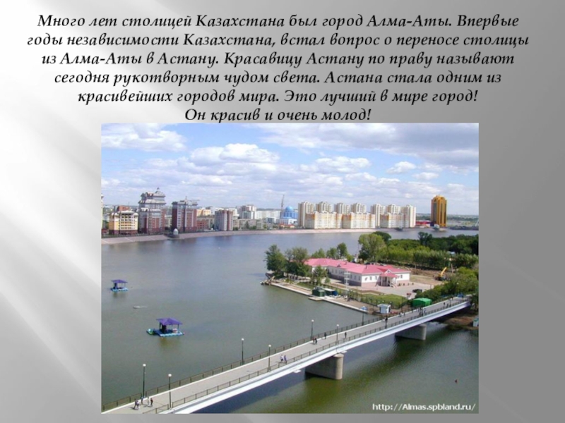 встал вопрос о переносе столицы из Алма-Аты в Астану. Красавицу Астану по праву называют сегодня рукотворным чудом света. Астана стала одним из красивейших городов мира. Это лучший в мире город! Он красив и очень молод!